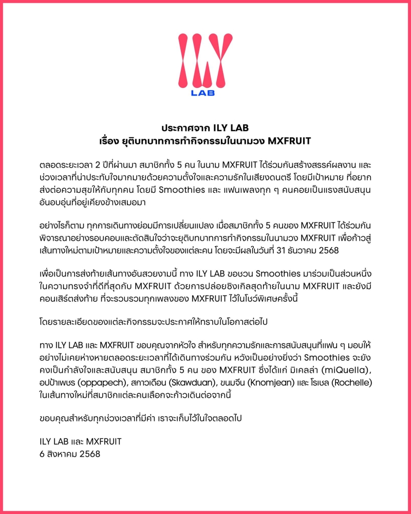 ส่งต่อความสุขให้กับทุกคน โดยมี Smoothies และ แฟนเพลงทุก ๆ คนคอยเป็นแรงสนับสนุน อันอบอุ่นที่อยู่เคียงข้างเสมอมา อย่างไรก็ตาม ทุกการเดินทางย่อมมีการเปลี่ยนแปลง เมื่อสมาชิกทั้ง 5 คนของ MXFRUIT ได้ร่วมกัน พิจารณาอย่างรอบคอบและตัดสินใจว่าจะยุติบทบาทการทํากิจกรรมในนามวง MXFRUIT เพื่อก้าวสู่ เส้นทางใหม่ตามเป้าหมายและความตั้งใจของแต่ละคน โดยจะมีผลในวันที่ 31 ธันวาคม 2568 เพื่อเป็นการส่งท้ายเส้นทางอันสวยงามนี้ ทาง ILY LAB ขอชวน Smoothies มาร่วมเป็นส่วนหนึ่ง ในความทรงจําที่ดีที่สุดกับ MXFRUIT ด้วยการปล่อยซิงเกิลสุดท้ายในนาม MXFRUIT และยังมี คอนเสิร์ตส่งท้าย ที่จะรวบรวมทุกเพลงของ MXFRUIT ไว้ในโชว์พิเศษครั้งนี้ โดยรายละเอียดของแต่ละกิจกรรมจะประกาศให้ทราบในโอกาสต่อไป