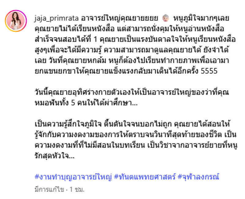 โดยระบุว่า อาจารย์ใหญ่คุณยาย หนูภูมิใจมากๆเลย คุณยายไม่ได้เรียนหนังสือ แต่สามารถนั่งคุมให้หนูอ่านหนังสือสำเร็จจนสอบได้ที่ 1 คุณยายเป็นแรงบันดาลใจให้หนูเรียนหนังสือสูงๆเพื่อจะได้มีความรู้ ความสามารถมาดูแลคุณยายได้ ยังจำได้เลย วันที่คุณยายหกล้ม หนูก็ต้องไปเรียนทำกายภาพเพื่อเอามายกแขนยกขาให้คุณยายแข็งแรงกลับมาเดินได้อีกครั้ง 5555