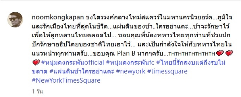 ล่าสุด ทาง หนุ่ม คงกระพัน เดินทางไปต่างประเทศกับครอบครัว ไม่ลืมโพสต์ภาพตัวเองกับป้าย#TruthFromThailand โดยได้ระบึข้อความว่า ธงไตรรงค์กลางไทม์สแควร์ในมหานครนิวยอร์คภูมิใจและรักเมืองไทยที่สุดในชีวิต แผ่นดินของข้า ใครอย่าแตะ ข้าจะรักษาไว้เพื่อให้ลูกหลานไทยตลอดไป ขอบคุณพี่น้องทหารไทยทุกท่านที่ช่วยปกปักรักษาอธิปไตยของชาติไทยเอาไว้ และเป็นกำลังใจให้กับทหารไทยในแนวหน้าทุกท่านครับ ขอบคุณ Plan B มากๆครับ