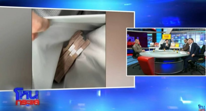 ทาง กรรชัย ยังเปิดภาพเป้ใส่เงินและถามว่าอยากรู้เป็นเป้ของใคร เอาไปทำอะไร เงินออกมาจากซองไหนหรือเปล่า พร้อมระบุว่า ไม่อยากเปิดคลิป เปิดแค่นี้พอ คลิปให้ พ.ต.อ.เอนก รองผู้บังคับการกองปราบปราม ไป พี่ไปตรวจสอบเอาเอง