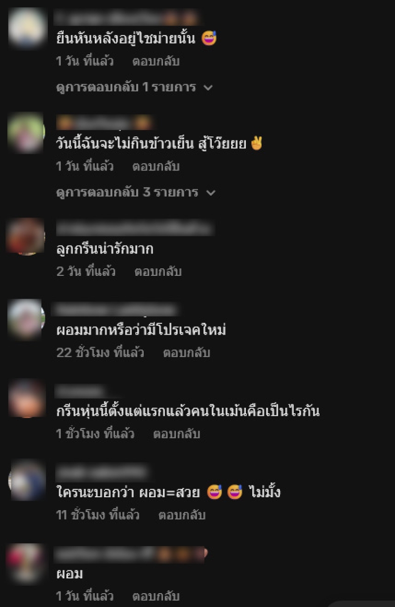 อาทิ วันนี้ฉันจะไม่กินข้าวเย็น สู้โว๊ย,ผอมมากหรือว่ามีโปรเจคใหม่,กรีนหุ่นนี้ตั้งแต่แรกแล้วคนในเม้นคือเป็นไรกัน,ใครนะบอกว่า ผอม=สวยไม่มั้ง,ผอม มาก,นึกว่าพี่ใหม่ดาวิกา,ผอมไปค่ะ,ช่วงก่อนเหมือนกรีนมีน้ำมีนวลกว่านี้อะ สวยฉ่ำมาก ตอนนี้ผอมไปดูไม่ค่อยสดใส เป็นต้น