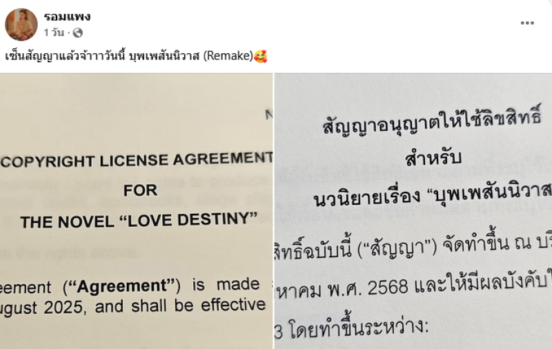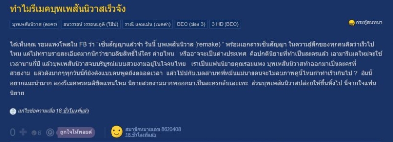 หลังจากที่ก่อนหน้านี้ รอมแพง เจ้าของบทประพันธ์ดัง บุพเพสันนิวาส ได้ออกมาโพสต์ยืนยันว่า ได้เซ็นสัญญาขายลิขสิทธิ์เพื่อนำไปสร้าง ฉบับรีเมค เป็นที่เรียบร้อยแล้ว ท่ามกลางชาวเน็ตต่างตั้งคำถามว่า มันเร็วไปหรือเปล่า เพราะเวอร์ชันล่าสุดเพิ่งออนแอร์ไปเมื่อปี 2561