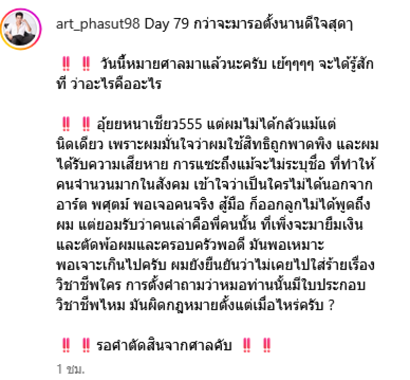 เป็นเรื่องถกเถียงผ่านโซเชียลกันสักพักสำหรับ หมออดีตนักร้องดัง ได้โพสต์ถึงประเด็นพระเอกกล้ามโต โดย อาร์ต พศุตม์ ได้ออกมาแสดงตัวเเละฟ้องกันในที่สุด ล่าสุดอาร์ตได้รับหมายศาลแล้ว พร้อมเผยว่า Day 79 กว่าจะมารอตั้งนานดีใจสุดๆ