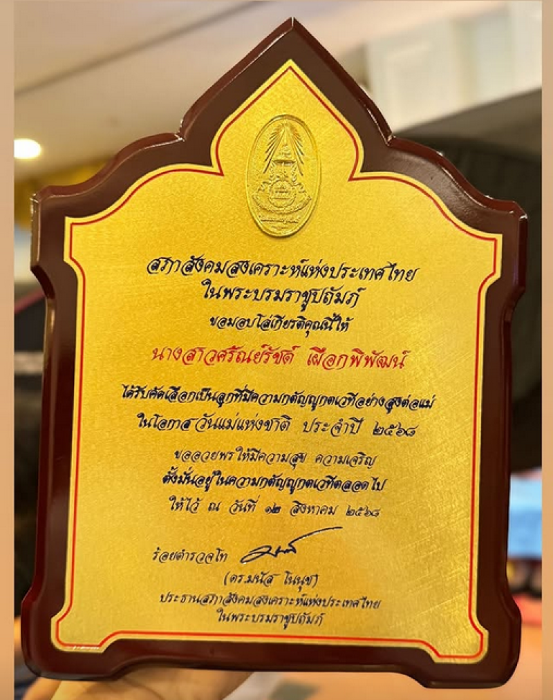 เนื่องในวันนี้ 12 ส.ค. 68 เป็นแม่แห่งชาติ ล่าสุดมิสแกรด์ไทยแลนด์ 2025 กชเบล ศรัณย์รัชต์ ได้เข้าพิธีรับพระราชทานโล่เกียรติคุณ ลูกที่มีความกตัญญูกตเวทีอย่างสูงต่อแม่ ประจำปี 2568 จากสมเด็จพระกนิษฐาธิราชเจ้า กรมสมเด็จพระเทพพระรัตนราชสุดาฯ สยามบรมราชกุมารี