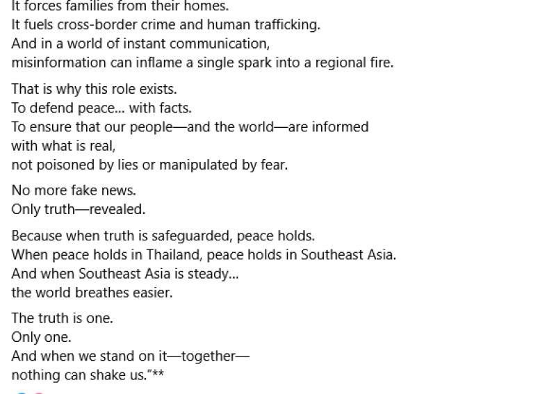 ไม่มีข่าวปลอมอีกต่อไป มีเพียงความจริง-เปิดเผย เพราะเมื่อความจริงได้รับการปกป้อง สันติภาพย่อมเกิดขึ้น เมื่อสันติภาพเกิดขึ้นในประเทศไทย สันติภาพย่อมเกิดขึ้นในเอเชียตะวันออกเฉียงใต้ และเมื่อเอเชียตะวันออกเฉียงใต้มั่นคง โลกก็จะหายใจได้สะดวกขึ้น ความจริงคือหนึ่งเดียว เพียงหนึ่งเดียว และเมื่อเรายืนหยัดบนความจริงนั้น-ด้วยกัน- ไม่มีอะไรสามารถสั่นคลอนเราได้