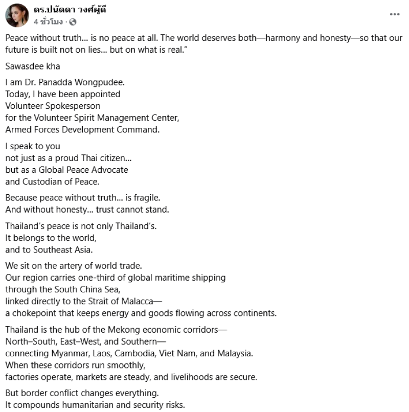 สวัสดีค่ะ ดร.ปนัดดา วงศ์ผุดี วันนี้ผมได้รับแต่งตั้งให้เป็น โฆษกอาสาสมัคร ประจำศูนย์บริหารจัดการจิตวิญญาณอาสาสมัคร กองบัญชาการพัฒนากำลังพล ฉันพูดกับคุณ ไม่ใช่แค่ในฐานะพลเมืองไทยผู้ภาคภูมิใจเท่านั้น แต่ในฐานะผู้สนับสนุนสันติภาพโลก และผู้พิทักษ์สันติภาพ เพราะสันติภาพที่ปราศจากความจริงก็เปราะบาง และหากปราศจากความซื่อสัตย์ ความไว้วางใจก็ไม่สามารถยืนหยัดอยู่ได้