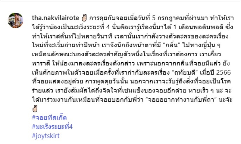 เราเกี้ยวพาราสี ให้น้องมาลงละครเรื่องดังกล่าว เพราะนอกจากกลิ่นที่จอยมีแล้ว ยังเห็นศักยภาพในตัวจอยเมื่อครั้งที่เรากำกับละครเรื่อง ฤทัยบดี เมื่อปี 2566 ที่จอยแสดงอยู่ด้วย การพูดคุยวันนั้น นอกจากเราจะรับรู้ถึงสิ่งที่จอยเป็นโรคร้ายแล้ว เรายังสัมผัสได้ถึงจิตใจที่เข้มแข็งของจอยอีกด้วย หายเร็ว ๆ นะ จะได้มาร่วมงานกันเหมือนที่จอยบอกกับพี่ว่า จอยอยากทำงานกับพี่ถา นะจ๊ะ #จอยทีสเกิ๊ต #มะเร็งระยะที่4 #joytskirt