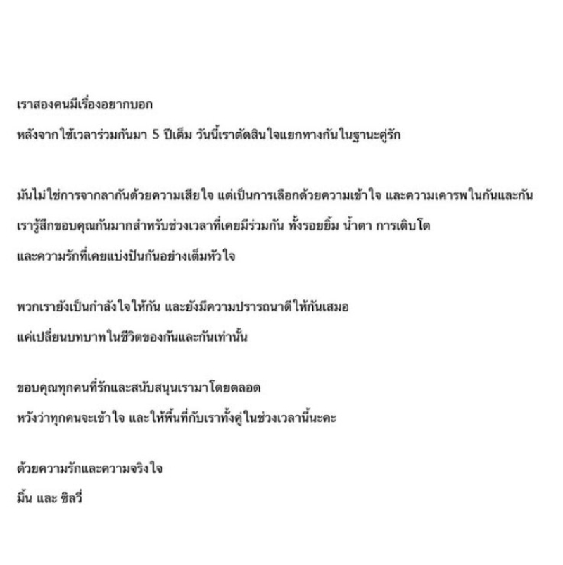 โดย ซิลวี่ ได้โพสต์ข้อความผ่านอินสตาแกรมส่วนตัว ระบุว่า "เราสองคนมีเรื่องอยากบอก หลังจากใช้เวลาร่วมกันมา 5 ปีเต็ม วันนี้เราตัดสินใจแยกทางกันในฐานะคู่รัก มันไม่ใช่การจากลากันด้วยความเสียใจ แต่เป็นการเลือกด้วยความเข้าใจ และความเคารพในกันและกัน เรารู้สึกขอบคุณกันมากสำหรับช่วงเวลาที่เคยมีร่วมกัน ทั้งรอยยิ้ม น้ำตา การเติบโตและความรักที่เคยแบ่งปันกันอย่างเต็มหัวใจ พวกเรายังเป็นกำลังใจให้กัน และยังมีความปรารถนาดีให้กันเสมอ แค่เปลี่ยนบทบาทในชีวิตของกันและกันเท่านั้น ขอบคุณทุกคนที่รักและสนับสนุนเรามาโดยตลอด หวังว่าทุกคนจะเข้าใจ และให้พื้นที่กับเราทั้งคู่ในช่วงเวลานี้นะคะ ด้วยความรักและความจริงใจ มิ้น และ ซิลวี่" พร้อมแคปชัน with love and respect from us. truly. thank you for understanding, loving, and support (แปลเป็นภาษาไทยว่า "ด้วยรักและเคารพจากพวกเรา ขอบคุณสำหรับความเข้าใจ ความรัก และการสนับสนุน )