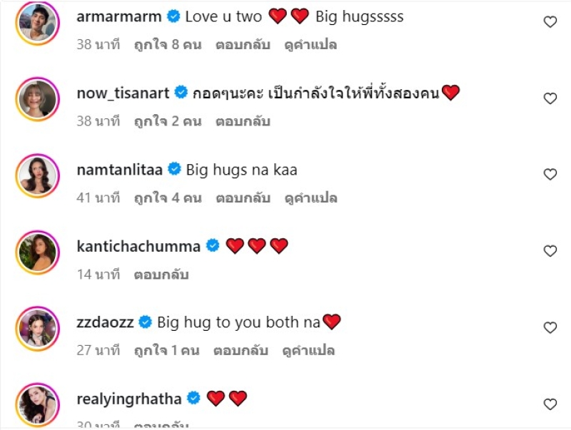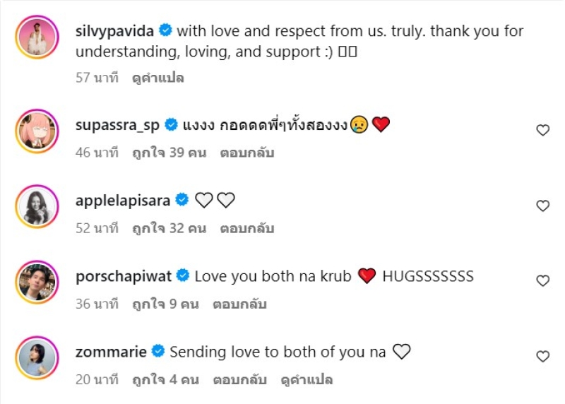 ท่ามกลาง เพื่อนดารานักแสดงและแฟนๆ เข้ามาคอมเมนต์ส่งกำลังใจให้ทั้งคู่กันจำนวนมาก