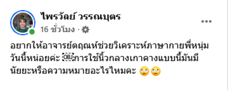 ซึ่งหลังจบรายการ เเพรรี่ ไพรวัลย์ ได้เเคปไปโพสต์พร้อมเขียนเเคปชั่นว่า อยากให้อาจารย์ตฤณห์ช่วยวิเคราะห์ภาษากายพี่หนุ่มวันนี้หน่อยค่ะ การใช้นิ้วกลางเกาคางแบบนี้มันมีนัยยะหรือความหมายอะไรไหมคะ