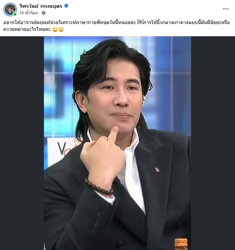 อยากให้อาจารย์ตฤณห์ช่วยวิเคราะห์ภาษากายพี่หนุ่มวันนี้หน่อยค่ะ การใช้นิ้วกลางเกาคางแบบนี้มันมีนัยยะหรือความหมายอะไรไหมคะ