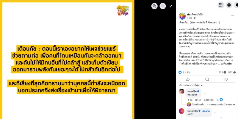 เรียกได้ว่า ทำเอาสะเทือนวงการบันเทิงเลยก็ว่าได้ เมื่อได้มีเพจดัง อย่าง บันเทิงหน้าตุ๊ด ได้ออกมาเผยว่า เตือนภัย... (ข้อความต่อไปนี้ คัดลอกมา ) ขอรบกวนส่งเรื่องนี้ให้ช่วยเป็นกระบอกเสียงหน่อยค่ะ เพราะมีคนโดนกันเยอะมาก แต่ส่วนใหญ่ไม่กล้าออกมาพูด หรือเรียกร้องเพราะกลัวอิทธิพลของหลานนายทหารใหญ่ที่เขาชอบเอามาอ้างว่ารู้จักและสนิท ไม่มีใครกล้ามีปัญหาเค้าเค้าเลยทั้งๆที่มีปัญหากับผู้เสียหายเยอะมากๆ