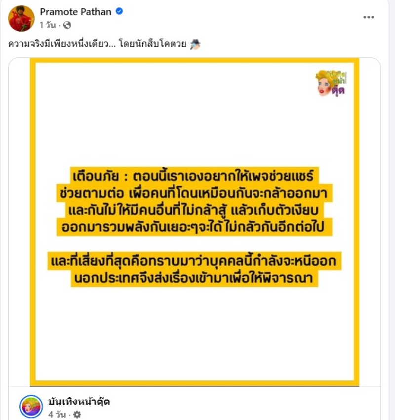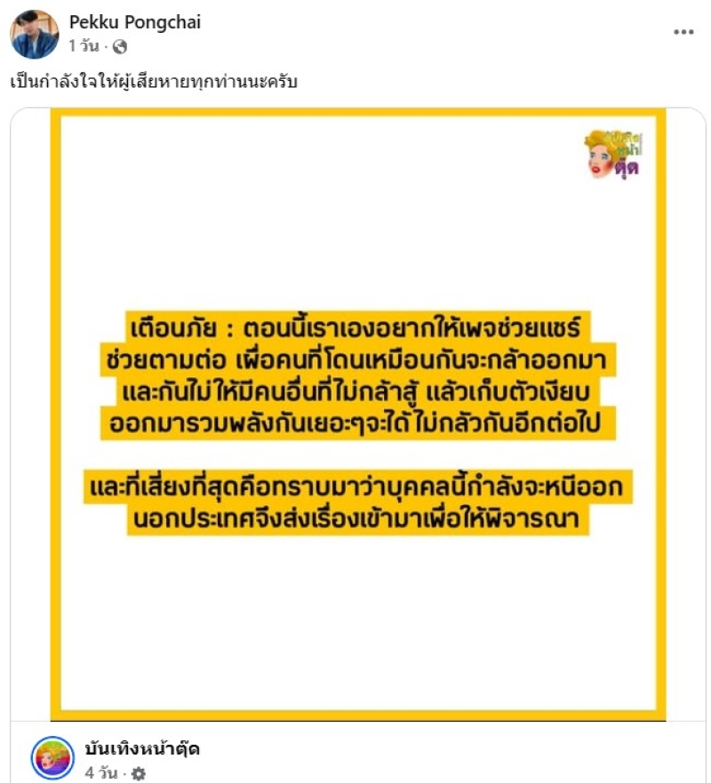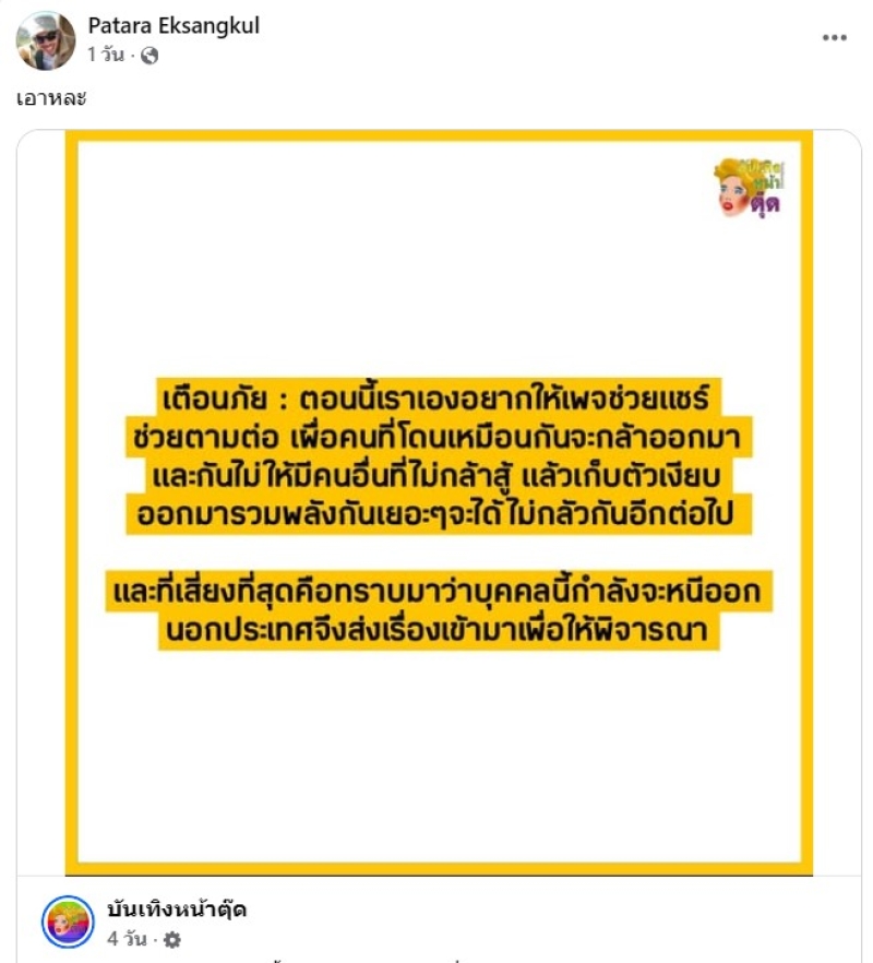 ตอนนี้เราเองอยากให้เพจช่วยแชร์ ช่วยตามต่อ เผื่อคนที่โดนเหมือนกันจะกล้าออกมา และกันไม่ให้มีคนอื่นที่ไม่กล้าสู้ แล้วเก็บตัวเงียบ ออกมารวมพลังกันเยอะๆจะได้ไม่กลัวกันอีกต่อไป และที่เสี่ยงที่สุดคือทราบมาว่าบุคคลนี้กำลังจะหนีออกนอกประเทศจึงส่งเรื่องเข้ามาเพื่อให้พิจารณา เรามีหลักฐาน และ พร้อมให้ข้อมูลทั้งหมดค่ะ