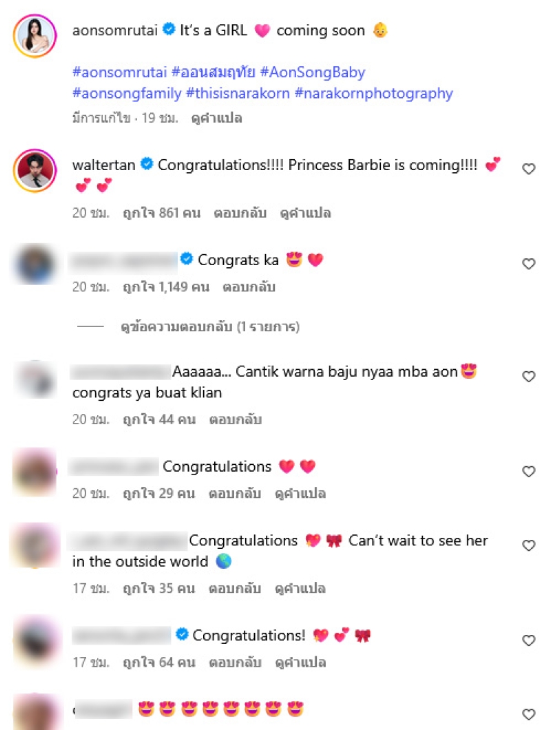 โดยมีการรฉายภาพอัลตร้าซาวด์ขึ้นจอโปรเจกเตอร์ขนาดใหญ่ และได้เฉลยเพศลูก คือ ลูกสาว ซึ่งออน ได้เขียนแคปชันว่า It’s a GIRL coming soon (อิโมจิเด็ก) ท่ามกลางคนในวงการต่างเข้ามาคอมเมนต์แสดงความยินดีกันอย่างมาก
