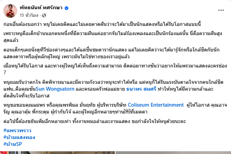 ทำเอาแฟนคลับต่างฮือฮากันอย่างเมื่อล่าสุดนางเอกหมอลำดังอย่าง แพรวพราว แสงทอง ได้ออกมาโพสต์ข่าวดีระบุว่า ก่อนอื่นต้องบอกว่า หนูไม่เคยคิดและไม่เคยคาดฝันว่าจะได้มาเป็นนักแสดงหรือได้รับโอกาสแบบนี้ เพราะหนูคือเด็กบ้านนอกคนหนึ่งที่มีความฝันแค่อยากจับไมล์ร้องเพลงและเป็นนักร้องแค่นั้น นี่คือความฝันสูงสุดแล้ว
