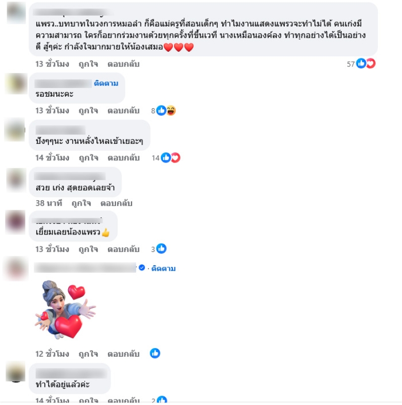 หนูขอขอบคุณแม่พร หรือคุณพรพิมล มั่นฤทัย ผู้บริหารบริษัท Coliseum Entertainment ผู้ให้โอกาส คุณอาจรัญ คุณอาตุ้ม พี่กระดุม ผู้กำกับโจ้ และผู้ใหญ่อีกหลายๆท่านที่เมตตา ต่อไปนี้ต้องขยันเพิ่มอีกหลายเท่า ทั้งงานหมอลำและงานแสดง ขอกำลังใจให้หนูด้วยนะคะ