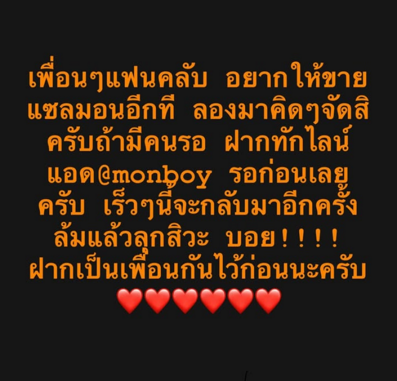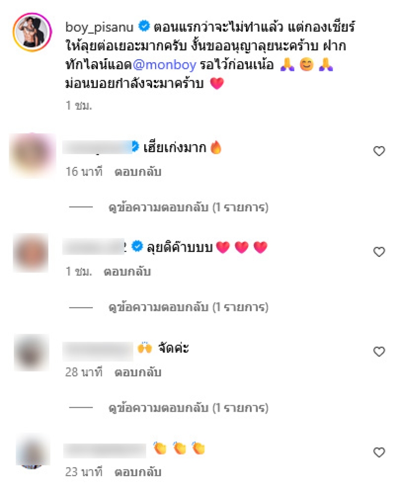 พร้อมเขียนแคปชั่นอีกด้วย อนแรกว่าจะไม่ทำแล้ว แต่กองเชียร์ให้ลุยต่อเยอะมากครับ งั้นขออนุญาตลุยนะคร้าบ ฝากทักไลน์แอด@monboy รอไว้ก่อนเน้อ ม่อนบอยกำลังจะมาคร้าบ ท่ามกลางแฟนๆเเละคนในวงการต่างชื่นชม
