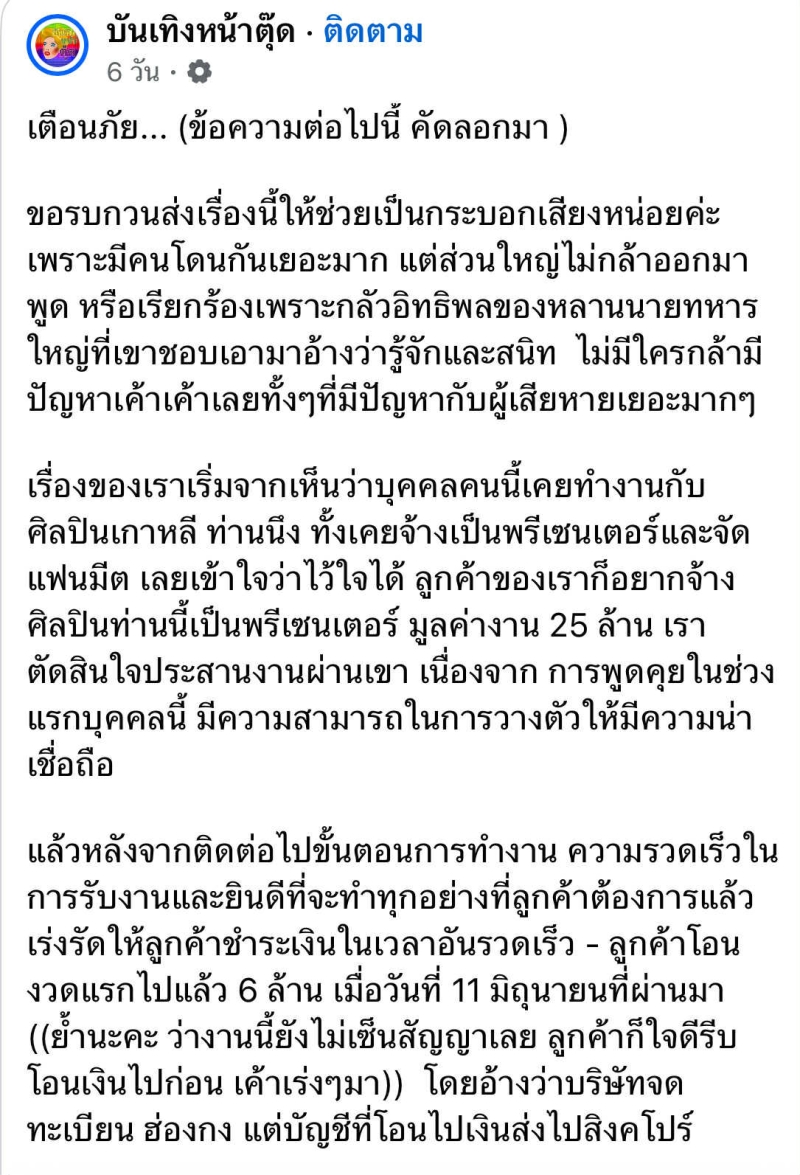 โดย เริ่มต้นจากการที่ผู้เสียหายรายหนึ่ง ถูกชักชวนให้ร่วมลงทุนในโปรเจ็กต์ศิลปินเกาหลี มูลค่า 25 ล้านบาท ให้โอนเงินงวดแรกจำนวน 6 ล้านบาท ทั้งที่ยังไม่ได้มีการเซ็นสัญญา อ้างว่า เป็นบริษัทจดทะเบียนในฮ่องกง แต่กลับให้โอนเงินเข้าบัญชีที่สิงคโปร์ หลังจากโอนเงินแล้ว มีคนเริ่มเตือนว่า เจ้าตัว มีประวัติการโกงซ้ำๆ