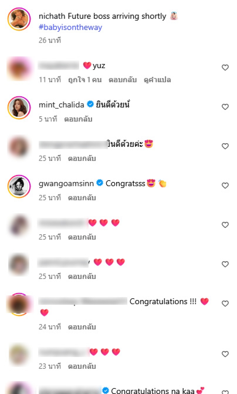 โดยโพสต์ภาพคู่สามีและรูปอัลตร้าซาวด์ พร้อมเขียนแคปชั่นไว้ว่า Future boss arriving shortly #babyisontheway (เจ้านายในอนาคตกำลังจะมาถึงเร็วๆ นี้) ท่ามกลงแฟนๆเเละคนในวงการต่างแสดงความยินดี