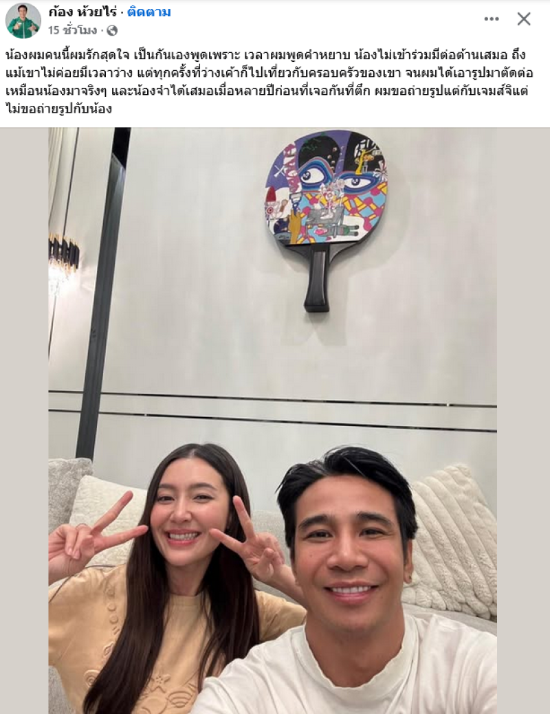 ทำเอาชาวเน็ตต่างเข้ามาคอมเมนต์กันอย่างมาก เมื่อล่าสุดนักร้องหนุ่ม ก้อง ห้วยไร่ ได้ออกมาโพสต์ข้อความถึงนางเอกดังอย่าง เบลล่า ราณี พร้อมเผยภาพคู่ ระบุว่า น้องผมคนนี้ผมรักสุดใจ เป็นกันเองพูดเพราะ เวลาพูดผมคำหยาบ น้องจะไม่เข้าร่วมและต่อต้านเสมอ
