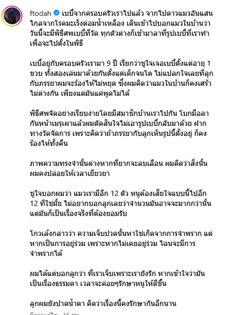 ฝากทางวัดจัดการ เพราะคิดว่าถ้าภรรยากับลูกเห็นรูปนี้ตั้งอยู่ ก็คงร้องไห้ทั้งคืน ภาพความทรงจำนั้นต่างหากที่ยากจะลบเลือน ผมคิดว่าสิ่งนั้นผมคงปล่อยให้เวลาเยียวยา ชูใจบอกผมว่า แมวเรามีอีก 12 ตัว หนูต้องเสียใจแบบนี้ไปอีก 12 ทีใช่มั้ย ไม่อยากบอกลูกเลยว่าจำนวนมันอาจจะมากกว่านั้น แต่มันก็เป็นเรื่องจริงที่ต้องยอมรับ