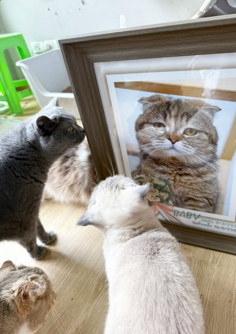 ทุกตัวต่างก็เข้ามาลาที่รูปเบบี๋ที่เราทำเพื่อจะไปตั้งในพิธี เบบี๋อยู่กับครอบครัวเรามา 9 ปี เรียกว่าชูใจเจอเบบี๋ตั้งแต่อายุ 1 ขวบ ทั้งสองเล่นมาด้วยกันตั้งแต่เด็กจนโต ไม่แปลกใจเลยที่ลูกกับภรรยาผมจะร้องไห้ไม่หยุด ซึ่งผมคิดว่าแมวในบ้านก็คงเศร้าไม่ต่างกัน เพียงแต่มันแค่พูดไม่ได้ พิธีศพจัดอย่างเรียบง่ายโดยมีสมาชิกบ้านเราไปกัน โบกมือลากันหน้าเมรุเผาแล้วผมตัดสินใจไม่เอารูปเบบี๋กลับมาด้วย