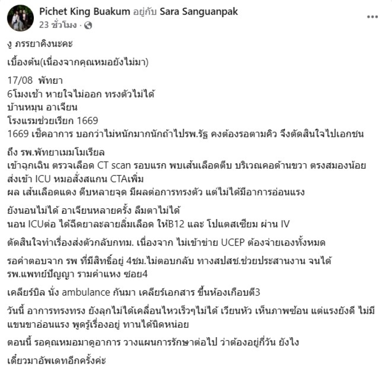 โดยทางภรรยาได้ออกมาอัพเดทว่า อัพเดท 2 อาการ คิง (ภรรยา โพสแทนค่า)