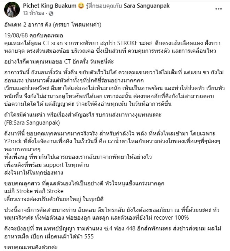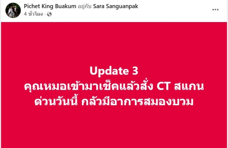 ล่าสุด ภรรยาของคิง ได้ออกมาเผยว่า Update 3 คุณหมอเข้ามาเช็คแล้วสั่ง CT สแกน ด่วนวันนี้ กลัวมีอาการสมองบวม