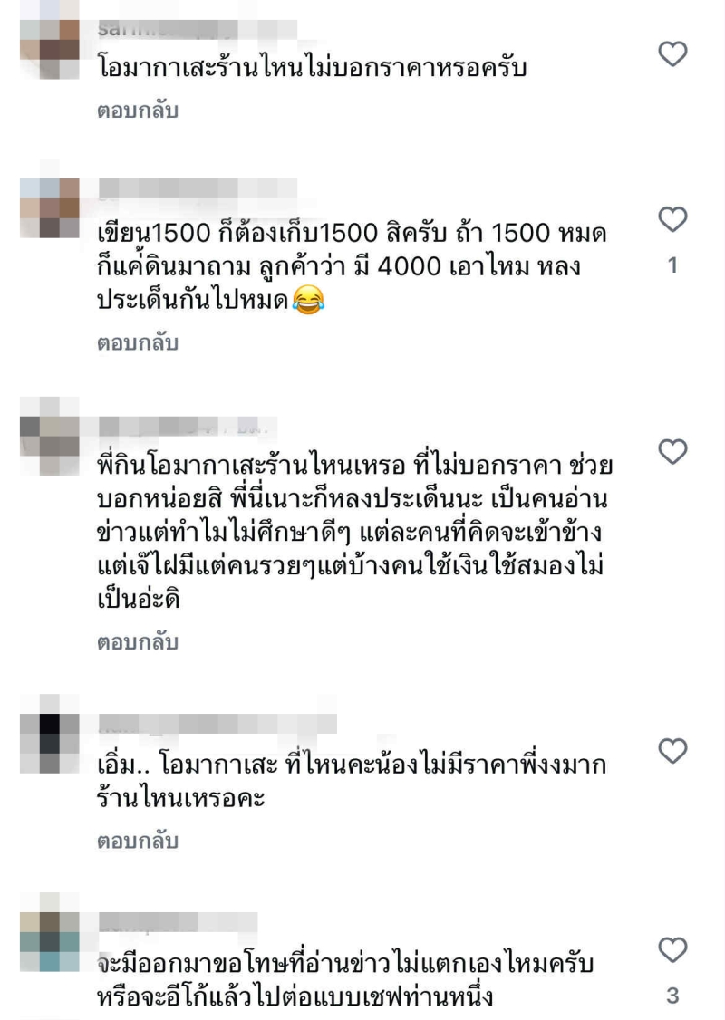 หลังจากนั้น มีชาวเน็ตหลายคนแห่เข้ามาคอมเมนต์อย่างล้นหลาม เช่น โอมากาเสะร้านไหนไม่บอกราคาหรอครับ , ถ้าราคาแก้วที่แจ้ง 390 บาท พอไปหน้างานเป็น 4,000 บาททำไง เป็นต้น