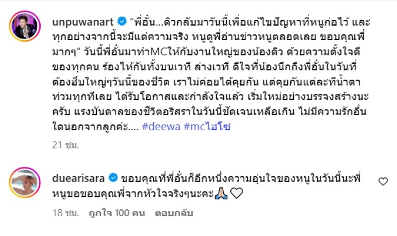 ล่าสุด ทาง อั๋น ภูวนาท ก็ได้โพสต์ภาพผ่านทางอินสตราแกรม @unpuwanart คู่กับสาวดิว ที่ออกอีเว้นต์พร้อมข้อความระบุว่า พี่อั๋น ดิวกลับมาวันนี้เพื่อแก้ไขปัญหาที่หนูก่อไว้ และทุกอย่างจากนี้จะมีแต่ความจริง หนูดูพี่อ่านข่าวหนูตลอดเลย ขอบคุณพี่มากๆ วันนี้พี่อั๋นมาทำMCให้กับงานใหญ่ของน้องดิว ด้วยความตั้งใจดีของทุกคน ร้องไห้กันทั้งบนเวที ล่างเวที ดีใจที่น้องนึกถึงพี่อั๋นในวันที่ต้องฮึบใหญ่ๆวันนี้ของชีวิต เราไม่ค่อยได้คุยกัน แต่คุยกันแต่ละทีน้ำตาท่วมทุกทีเลย ได้รับโอกาสและกำลังใจแล้ว เริ่มใหม่อย่างบรรจงสร้างนะครับ แรงบันดาลของชีวิตอริสราในวันนี้ชัดเจนเหลือเกิน ไม่มีความรักอื่นใดนอกจากลูกค่ะ