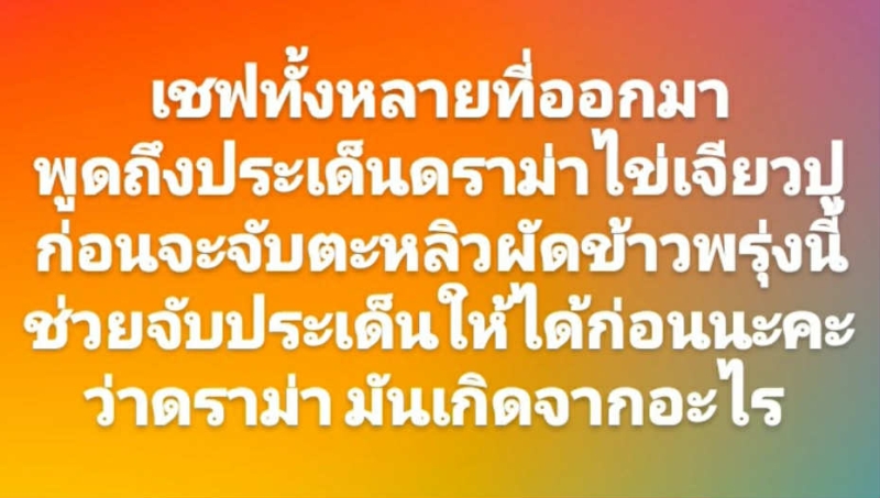 โดย มีข้อความว่า เชฟทั้งหลาย ที่ออกมาพูดถึงประเด็นดราม่าไข่เจียวปู ก่อนจะจับตะหลิวผัดข้าวพรุ่งนี้ ช่วยจับประเด็นให้ได้ก่อนนะคะ ว่าดราม่ามันเกิดจากอะไร