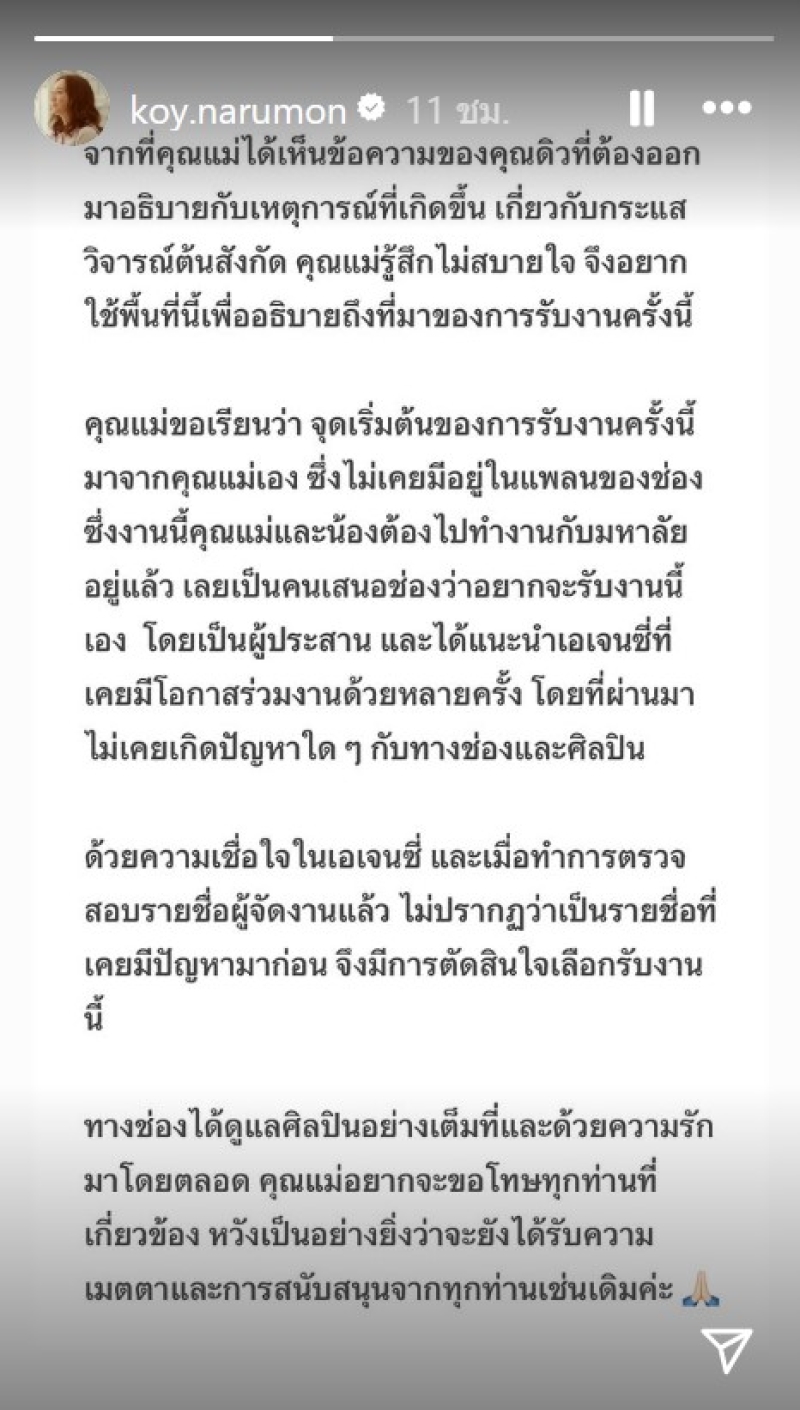 ทางช่องได้ดูแลศิลปินอย่างเต็มที่และด้วยความรักมาโดยตลอด คุณแม่อยากจะขอโทษทุกท่านที่เกี่ยวข้อง หวังเป็นอย่างยิ่งว่าจะยังได้รับความเมตตาและการสนับสนุนจากทุกท่านเช่นเดิมค่ะ