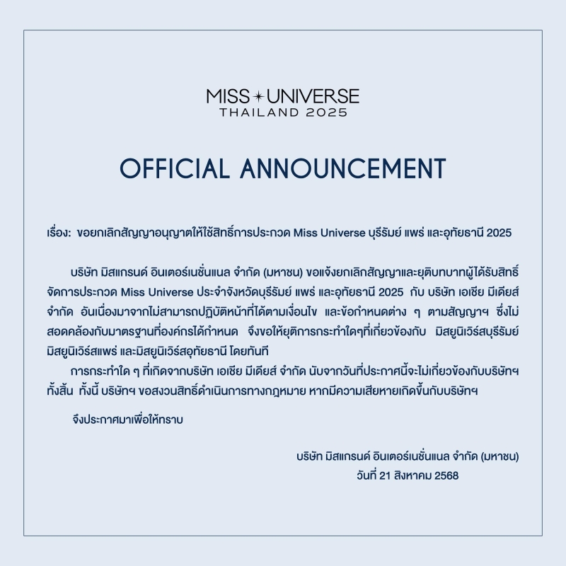 บริษัท มิสแกรนด์ อินเตอร์เนชั่นแนล จํากัด (มหาชน) ขอแจ้งยกเลิกสัญญาและยุติบทบาทผู้ได้รับสิทธิ์ จัดการประกวด Miss Universe ประจําจังหวัดบุรีรัมย์ แพร่ และอุทัยธานี 2025 กับ บริษัท เอเชีย มีเดียส์ จํากัด อันเนื่องมาจากไม่สามารถปฏิบัติหน้าที่ได้ตามเงื่อนไข และข้อกําหนดต่าง ๆ ตามสัญญาฯ ซึ่งไม่ สอดคล้องกับมาตรฐานที่องค์กรได้กําหนด จึงขอให้ยุติการกระทําใดๆที่เกี่ยวข้องกับ มิสยูนิเวิร์สบุรีรัมย์ มิสยูนิเวิร์สแพร่ และมิสยูนิเวิร์สอุทัยธานี โดยทันที