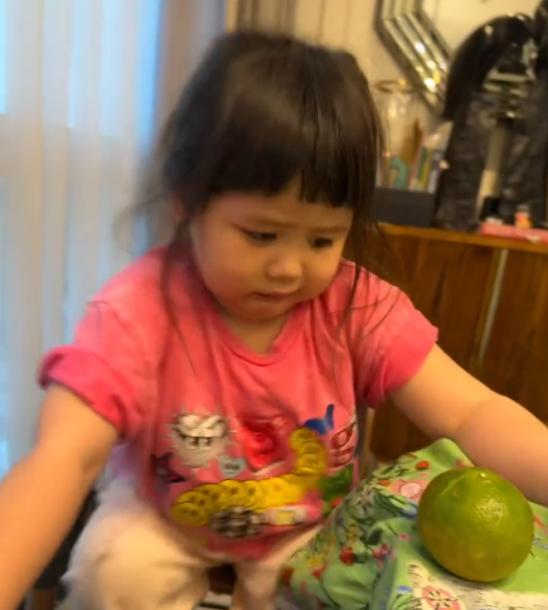 งานนี้พี่มอสแกล้งหยิบส้มไปใกล้ๆ ถึงสองครั้ง แต่น้องเกลกลับเขยิบหนี พร้อมทำหน้าตากลัวสุดขีด