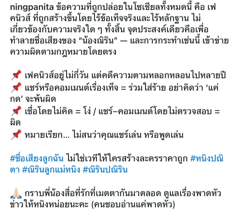 เรียกได้ว่า กลายเป็นประเด็นร้อนแรงที่สร้างความเสียหายแก่คนในวงการบันเทิง เมื่อมีข่าวปลอมเกี่ยวกับ หนิง ปณิตา และลูกสาว น้องณิริน ถูกเผยแพร่ในโลกออนไลน์ ทำให้หนิงต้องออกมาเคลื่อนไหวทันที ผ่านอินสตาแกรม ningpanita