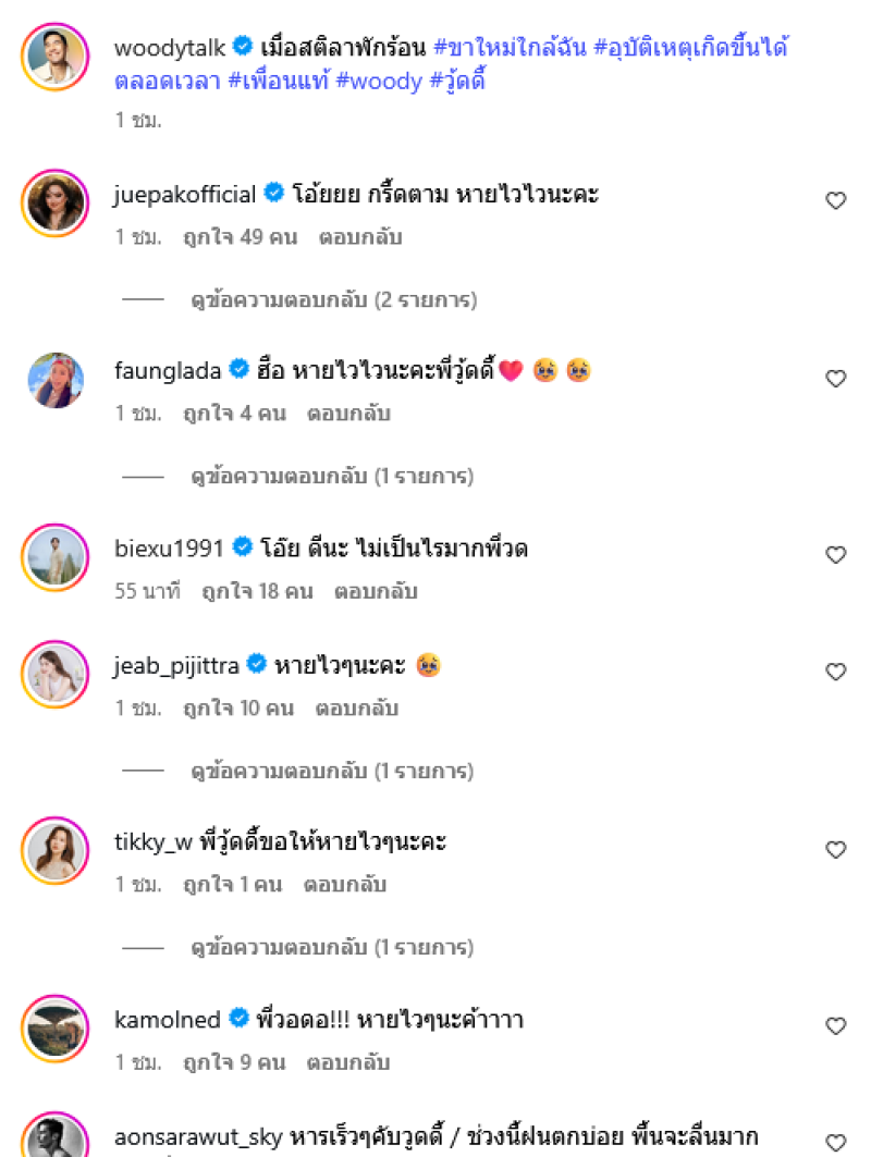 โดยมีเพื่อนในวงการเข้ามาคอมเมนต์ อาทิ โอ้ยยย กรี้ดตาม หายไวไวนะคะ,ฮือ หายไวไวนะคะพี่วู้ดดี้,หายไวๆนะคะ,โอ๊ย ดีนะ ไม่เป็นไรมากพี่,พี่วู้ดดี้ขอให้หายไวๆนะคะ,หายเร็วๆคับวูดดี้ / ช่วงนี้ฝนตกบ่อย พื้นจะลื่นมากหากมีตะไคร่