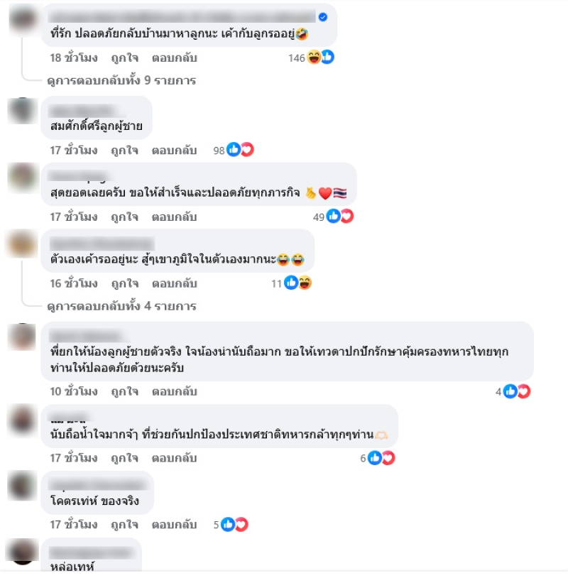ท่ามกลางชาวเน็ตต่างเข้ามาคอมเมนต์ชื่นชมกันอย่างมาก อาทิ สุดยอดเลยครับ ขอให้สำเร็จและปลอดภัยทุกภารกิจ,นับถือน้ำใจมากจ้ๅ ที่ช่วยกันปกป้องประเทศชาติทหารกล้าทุกๆท่าน,โคตรเท่ห์ ของจริง,ลูกผู้ชาย ของแท้ ชื่นชม,แคล้วคลาดปลอดภัยกันทุกนายนะคะ บุญรักษาพระคุ้มครองค่ะ