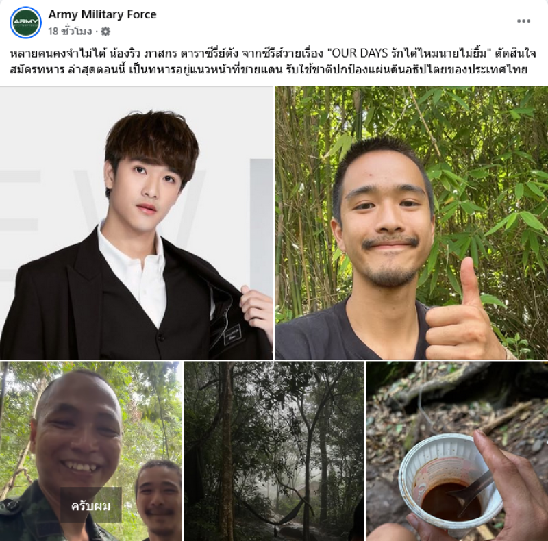 ทำเอาแฟนๆต่างชื่นชมไม่น้อยเมื่อล่าสุดทางด้านเพจArmy Military Force ได้ออกมาโพสต์ข้อความว่า หลายคนคงจำไม่ได้ น้องริว ภาสกร ดาราซีรี่ย์ดัง จากซีรีส์วายเรื่อง OUR DAYS รักได้ไหมนายไม่ยิ้ม ตัดสินใจสมัครทหาร ล่าสุดตอนนี้ เป็นทหารอยู่แนวหน้าที่ชายแดน รับใช้ชาติปกป้องแผ่นดินอธิปไตยของประเทศไทย