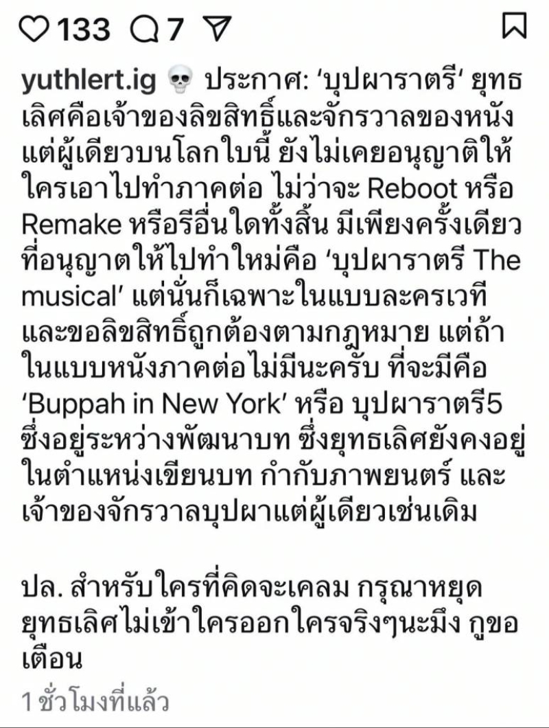 ที่อนุญาตให้ไปทำใหม่คือ บุปผาราตรี The musical' แต่นั่นก็เฉพาะในแบบละครเวที และขอลิขสิทธิ์ถูกต้องตามกฎหมายแต่ถ้าในแบบหนังภาคต่อไม่มีนะครับ ที่จะมีคือ Buppah in New York หรือ บุปผาราตรี5 ซึ่งอยู่ระหว่างพัฒนาบท ซึ่งยุทธเลิศยังคงอยู่ ในตำแหน่งเขียนบท กำกับภาพยนตร์ และเจ้าของจักรวาลบุปผาแต่ผู้เดียวเช่นเดิม ปล. สำหรับใครที่คิดจะเคลม กรุณาหยุด ยุทธเลิศไม่เข้าใครออกใครจริงๆนะมึง xูขอเตือน