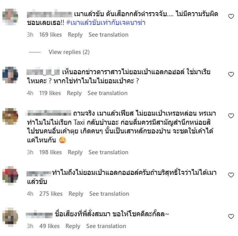 งานนี้ชาวเน็ตไม่ปล่อยผ่าน แห่คอมเมนต์ถล่มไอจีแบบไม่ยั้ง เช่น ถ้าไม่เมา ทำไมไม่เป่า, ผิดหวังมาก ขอเลิกติดตาม, เมาแล้วขับดันกลัวดำรวจจับ ไม่มีความรับผิดชอบเลยเธอ พร้อมแฮชแท็ก #เมาแล้วขับเท่ากับเจตนาฆ่า โผล่ให้เห็นเพียบ