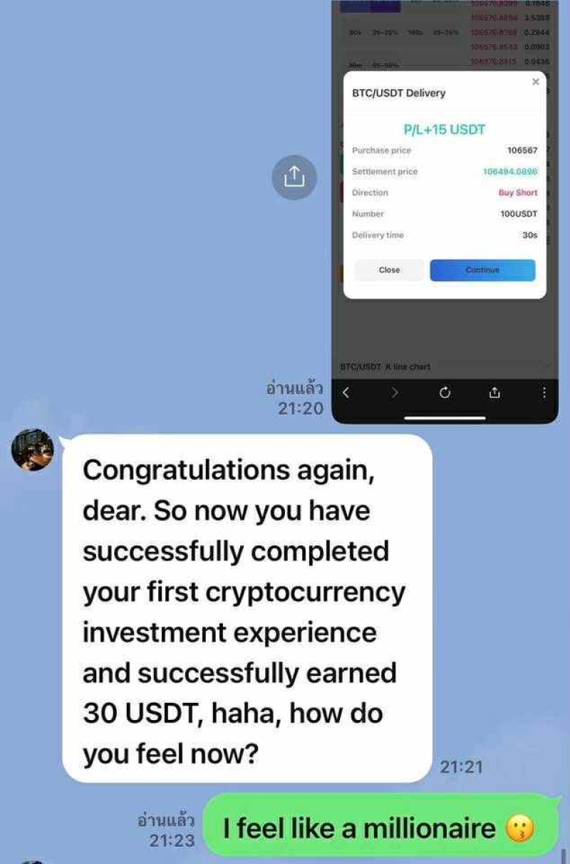 หลังจาก ที่ทำการเทรดตามที่มันแนะนำ ต๊ะ พบว่า ตัวเลขในบัญชีของเธอ เริ่มเพิ่มขึ้น ทำให้เริ่มเชื่อใจในตัวมันมากขึ้น เธอ ถูกชักชวนให้ลงทุนต่อไป จึงเริ่มรู้สึกสงสัย และตรวจสอบจนพบว่า เขาใช้รูปภาพ และข้อมูลปลอม เพื่อหลอกลวงเธอ