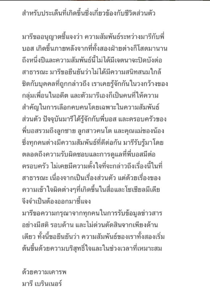 สาธารณะ มารีขอยืนยันว่าไม่ได้มีความสนิทสนมใกล้ ชิดกับบุคคลที่ถูกกล่าวถึง เราเคยรู้จักกันในวงกว้างของ กลุ่มเพื่อนในอดีต และตัวมารีเองก็เป็นคนที่ให้ความ สําคัญในการเลือกคบคนโดยเฉพาะในความสัมพันธ์ ส่วนตัว ปัจจุบันมารีได้รู้จักกับพี่บอส และครอบครัวของ พี่บอสรวมถึงลูกชาย ลูกสาวคนโต และคุณแม่ของน้อง ซึ่งทุกคนต่างมีความสัมพันธ์ที่ดีต่อกัน มารีรับรู้มาโดย ตลอดถึงความรับผิดชอบและการดูแลที่พี่บอสมีต่อ ครอบครัว ไม่เคยมีความตั้งใจที่จะกล่าวถึงเรื่องนี้ในที่ สาธารณะ เนื่องจากเป็นเรื่องส่วนตัว แต่ด้วยเรื่องของ ความเข้าใจผิดต่างๆที่เกิดขึ้นในสื่อและโซเชียลมีเดีย