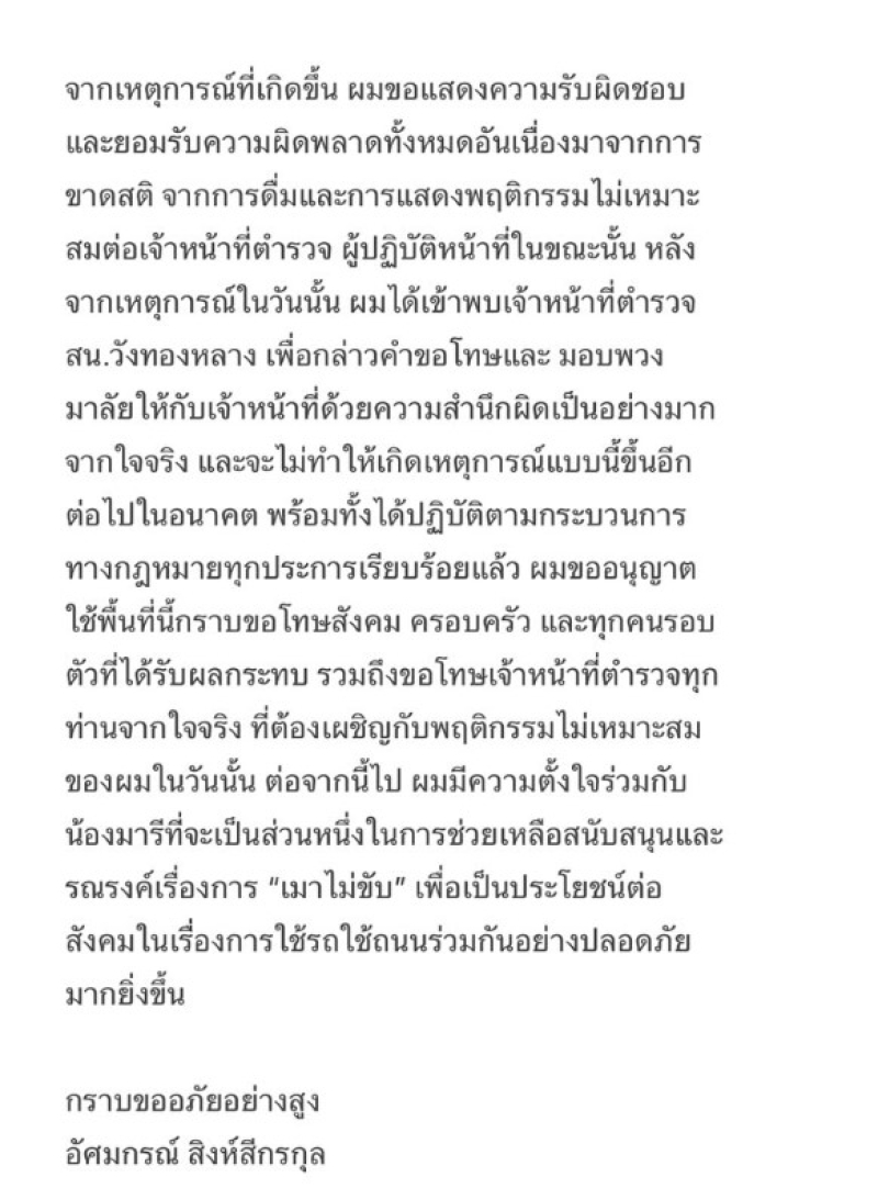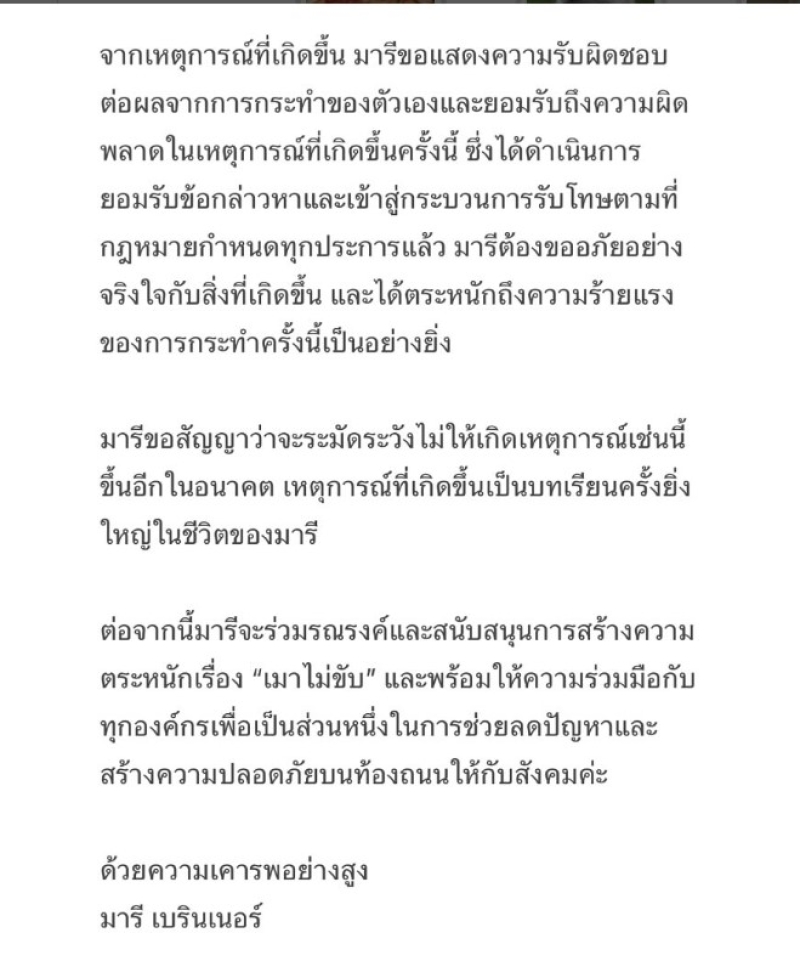 ผมขออนุญาต ใช้พื้นที่นี้กราบขอโทษสังคม ครอบครัว และทุกคนรอบ ตัวที่ได้รับผลกระทบ รวมถึงขอโทษเจ้าหน้าที่ตํารวจทุก ท่านจากใจจริง ที่ต้องเผชิญกับพฤติกรรมไม่เหมาะสม ของผมในวันนั้น ต่อจากนี้ไป ผมมีความตั้งใจร่วมกับ น้องมารีที่จะเป็นส่วนหนึ่งในการช่วยเหลือสนับสนุนและ รณรงค์เรื่องการ "เมาไม่ขับ" เพื่อเป็นประโยชน์ต่อ สังคมในเรื่องการใช้รถใช้ถนนร่วมกันอย่างปลอดภัย มากยิ่งขึ้น