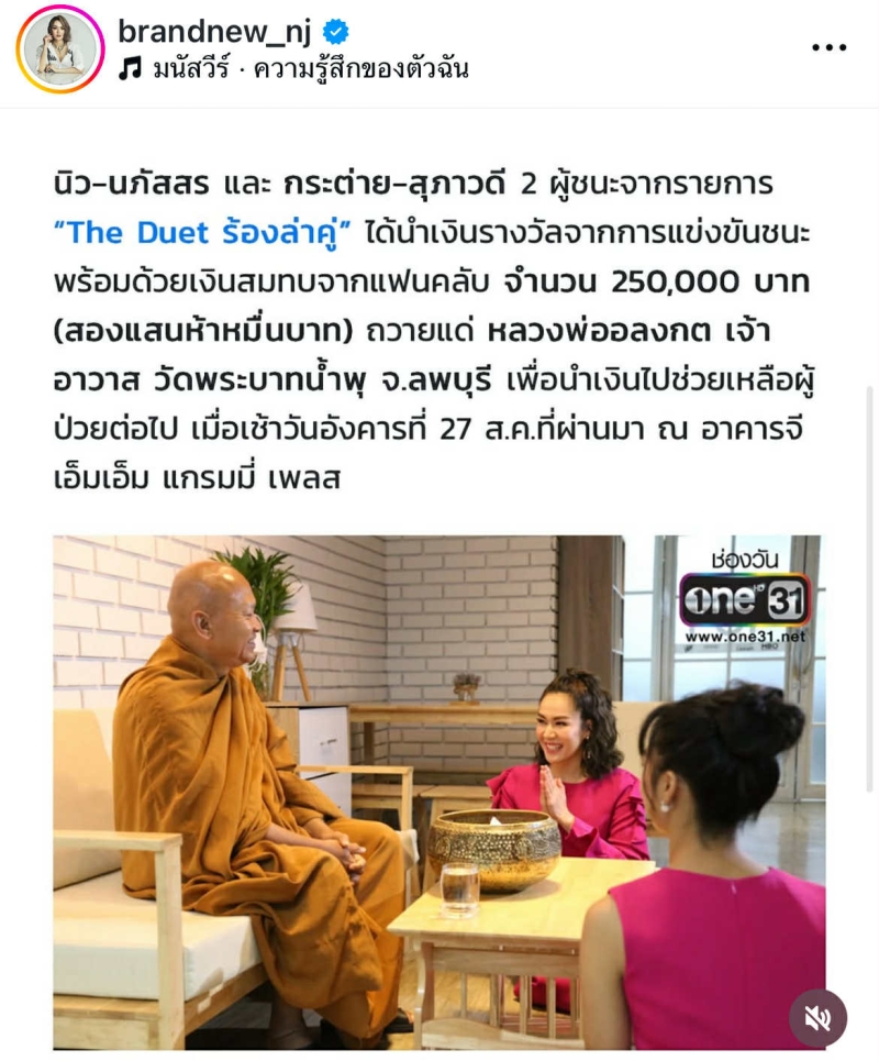 โดย นิว ได้ย้อนความทรงจำ เล่าผ่านอินสตาแกรม brandnew_nj พร้อมโพสต์ภาพ และข้อความว่า 27 สิงหาคม 2562 ครบ 5 ปีพอดี ที่ได้ถวายเงิน 250,000 บาท เป็นเงินรางวัลจากการชนะในรายการ The Duet ร้องล่าคู่ ของช่อง One เงินจำนวนนี้ มอบให้วัดพระบาทน้ำพุด้วยความตั้งใจ จากตน และทีมงาน