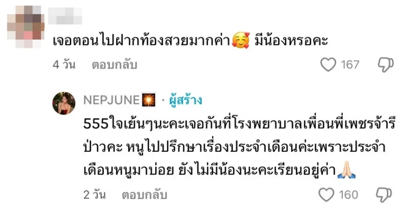 เจ้าตัวเผยว่า จริงๆ แล้วเนปจูนไปพบหมอเพราะมีประจำเดือนมาบ่อย ไม่ใช่ฝากครรภ์แต่อย่างใด และยังแซวขำๆ ว่า ตอนนี้ท้องลมครับ พร้อมบอกว่าหมอที่ไปหาก็ไม่ใช่หมอตรวจครรภ์