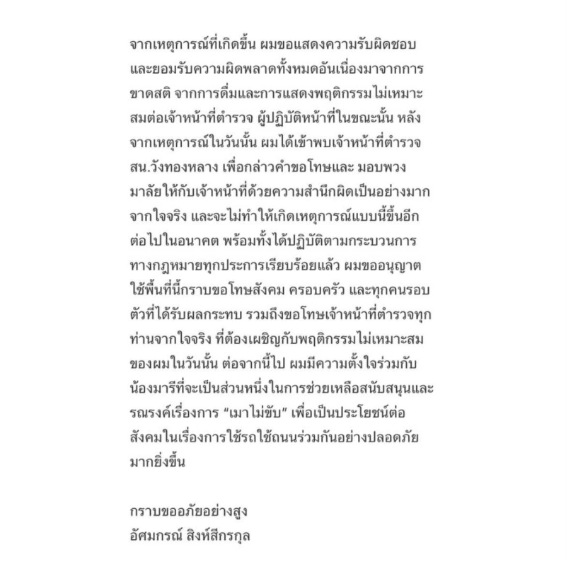 เพื่อแสดงความรับผิดชอบ บอส ได้เข้าพบเจ้าหน้าที่ตำรวจ ที่สน.วังทองหลาง และมอบพวงมาลัยให้เป็นการขอโทษอย่างจริงใจ พร้อมสัญญาว่า จะไม่ให้เหตุการณ์เช่นนี้ เกิดขึ้นอีกในอนาคต และปฏิบัติตามกระบวนการทางกฎหมายอย่างเคร่งครัด