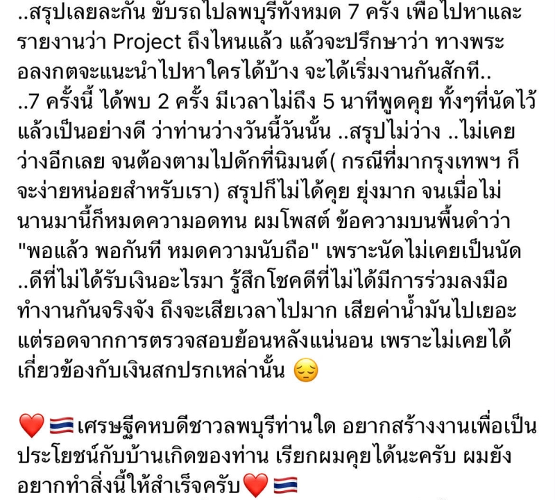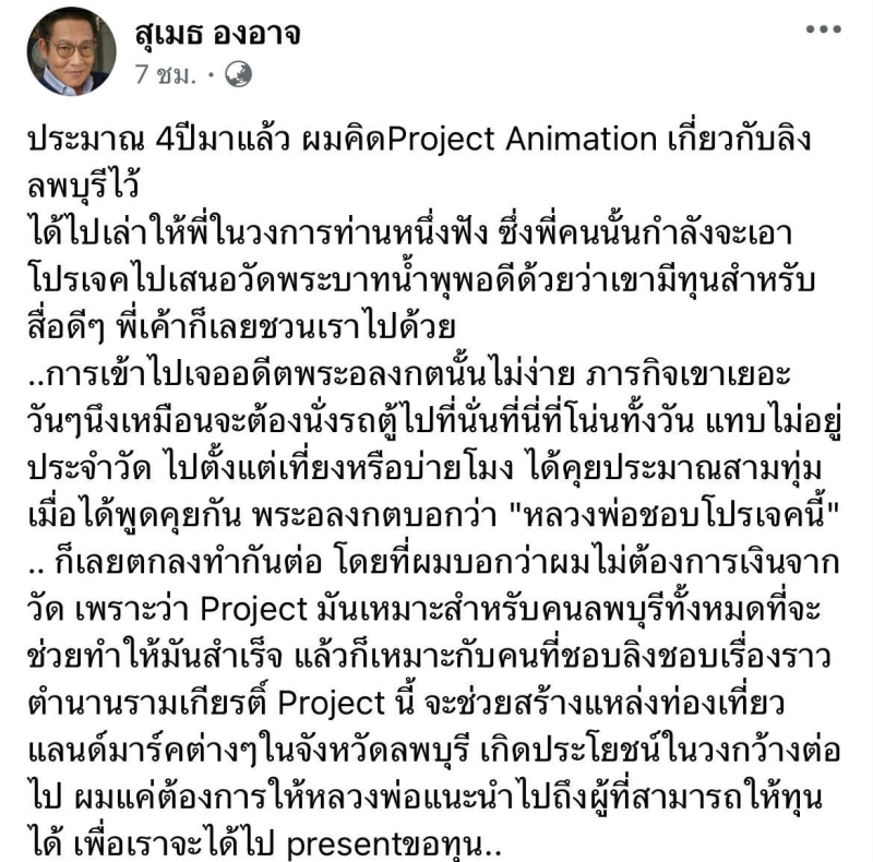 ซึ่ง เขา ยังทิ้งท้ายอีกว่า หากมีเศรษฐี หรือ คหบดีในลพบุรี ที่สนใจร่วมทำโปรเจกต์นี้ เพื่อประโยชน์ของบ้านเกิด เขายินดีที่จะพูดคุย และทำให้สำเร็จ เพื่อต่อยอดให้กับสังคม