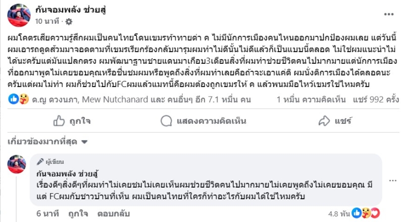เรียกได้ว่า ทำเอาทางด้าน กันจอมพลัง ต้องออกมาโพสต์ตัดพ้อกันเลยทีเดียว เมื่อล่า วันนี้ 28 ส.ค ด้านเพจ กันจอมพลัง ช่วยสู้ ได้ออกมาโพสต์ว่า ผมโคตรเสียความรู้สึกผมเป็นคนไทยโดนเขมรท้าทายด่า ค ไม่มีนักการเมืองคนไหนออกมาปกป้องผมเลย แต่วันนี้ผมเอารถดูดส้วมมาจอดตามที่เขมรเรียกร้องกลับมารุมผมทำไม่ดีนั้นไม่ดีแล้วก็เป็นแบบนี้ตลอด ไม่ใช่ผมแนะนำไม่ได้นะครับแต่มันแปลกตรง ผมพัฒนาฐานชายแดนมาเกือบ3เดือนสิ่งที่ผมทำช่วยชีวิตคนไปมากมายแต่นักการเมืองที่ออกมาพูดไม่เคยขอบคุณหรือชื่นชมผมหรือพูดถึงสิ่งที่ผมทำเลยคือถ้าจะเอาแค่ติ ผมนั่งติการเมืองได้ตลอดนะครับแต่ผมไม่ทำ ผมก็ช่วยไปกับFCผมแล้วแมทนี้คือผมต้องถูกเขมรให้ ค แล้วพนมมือไหว้เขมรใช่ไหมครับ