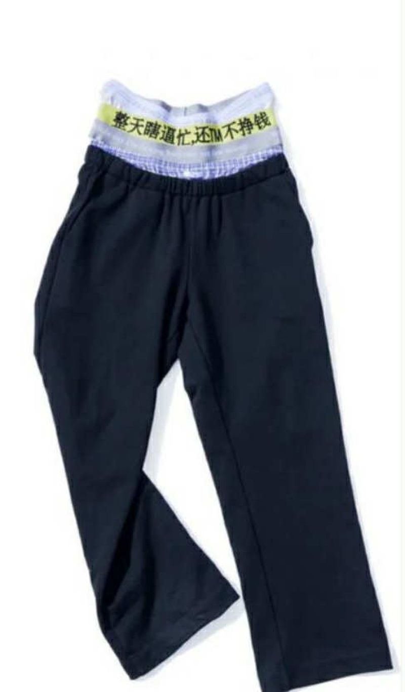 โดย ข้อความที่เขียนบนกางเกงยีนส์นั้นคือ ALL DAY DOING USELESS SHIT AND STILL NOT GETTING ANY MONEY