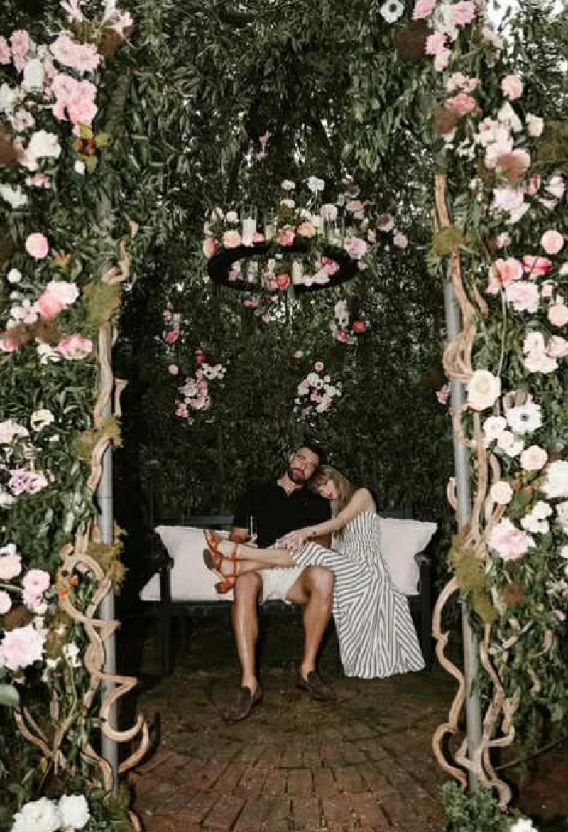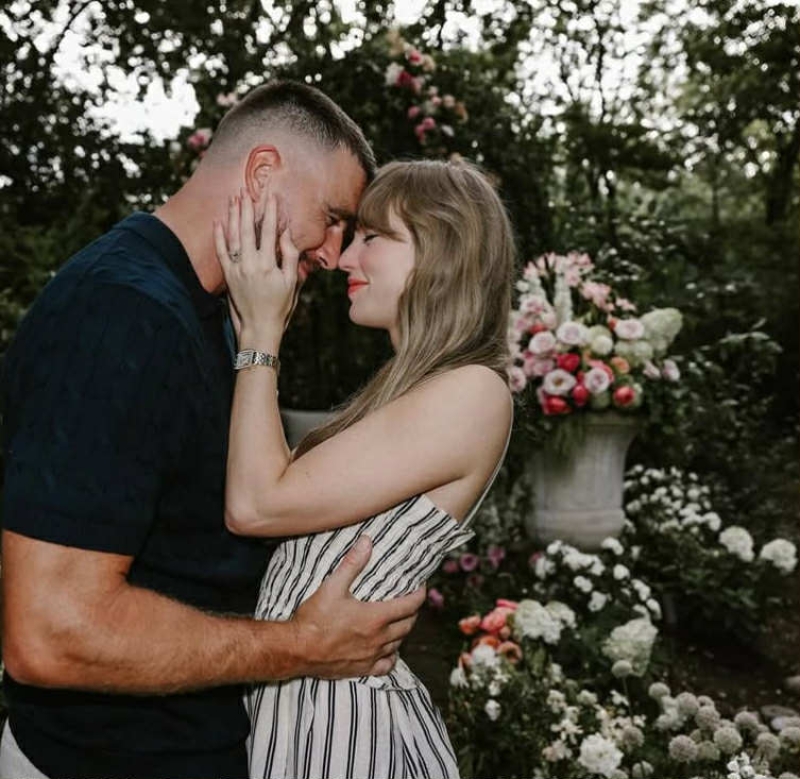 ในภาพประกาศหมั้น ที่กลายเป็นที่กล่าวขวัญ เทย์เลอร์ สวิฟต์ สวมชุดเดรสลายทางสุดหรูจากแบรนด์ Ralph Lauren และเครื่องประดับหรูหรา จาก Cartier รวมทั้งแหวนหมั้นสุดเอกลักษณ์ที่ออกแบบ โดย Kindred Lubeck จาก Artifex Fine